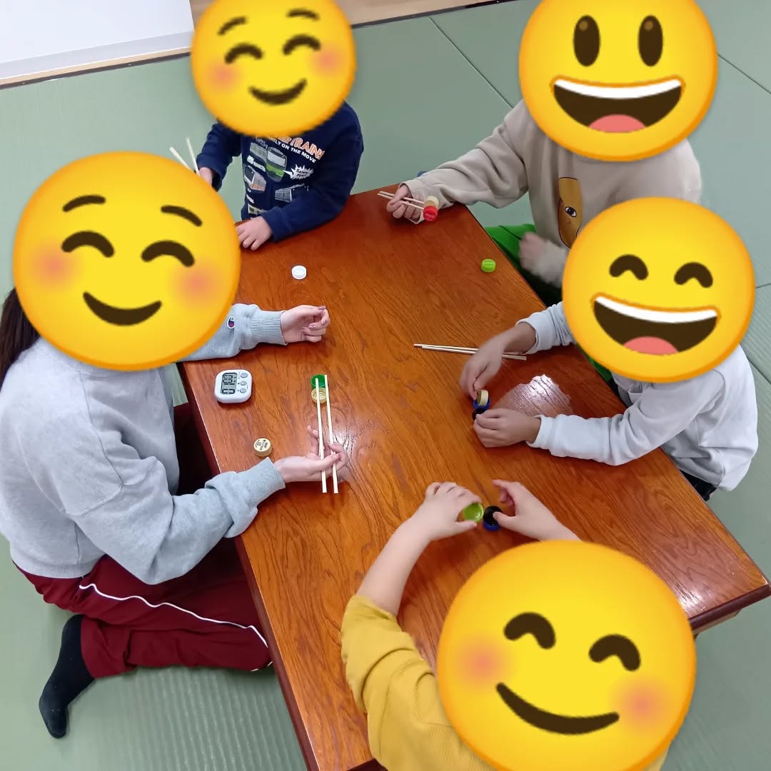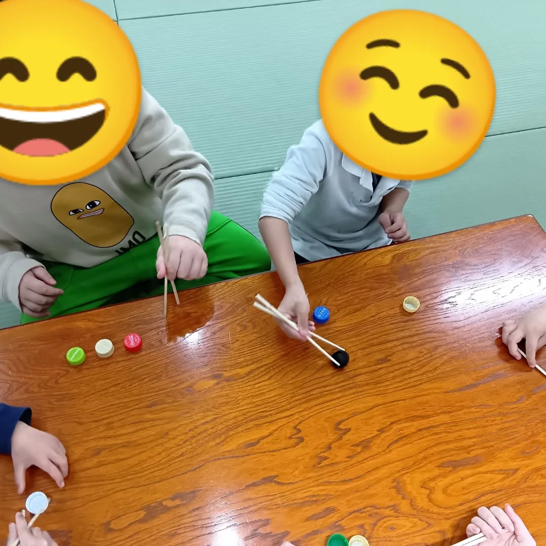 お箸でキャップをつかみ、バランスを考えながら慎重に積み重ねていきます🗼「むずかしい!」「できた!」と、試行錯誤しながら取り組む姿が見られました👏✨